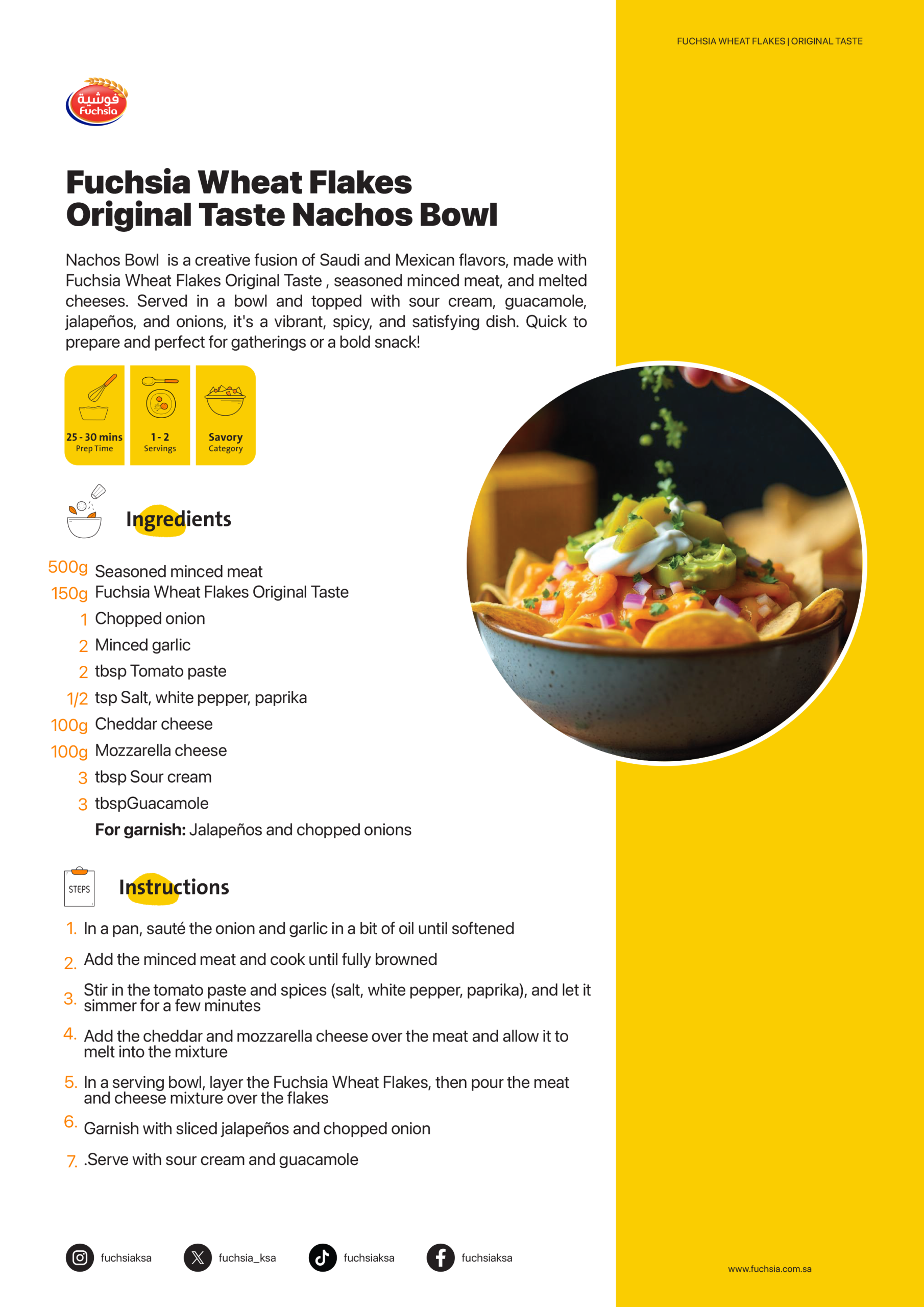 Nachos Bowl is a creative fusion of Saudi and Mexican flavors, made with Fuchsia Wheat Flakes Original Taste , seasoned minced meat, and melted cheeses. Served in a bowl and topped with sour cream, guacamole, jalapeños, and onions, it's a vibrant, spicy, and satisfying dish. Quick to prepare and perfect for gatherings or a bold snack!